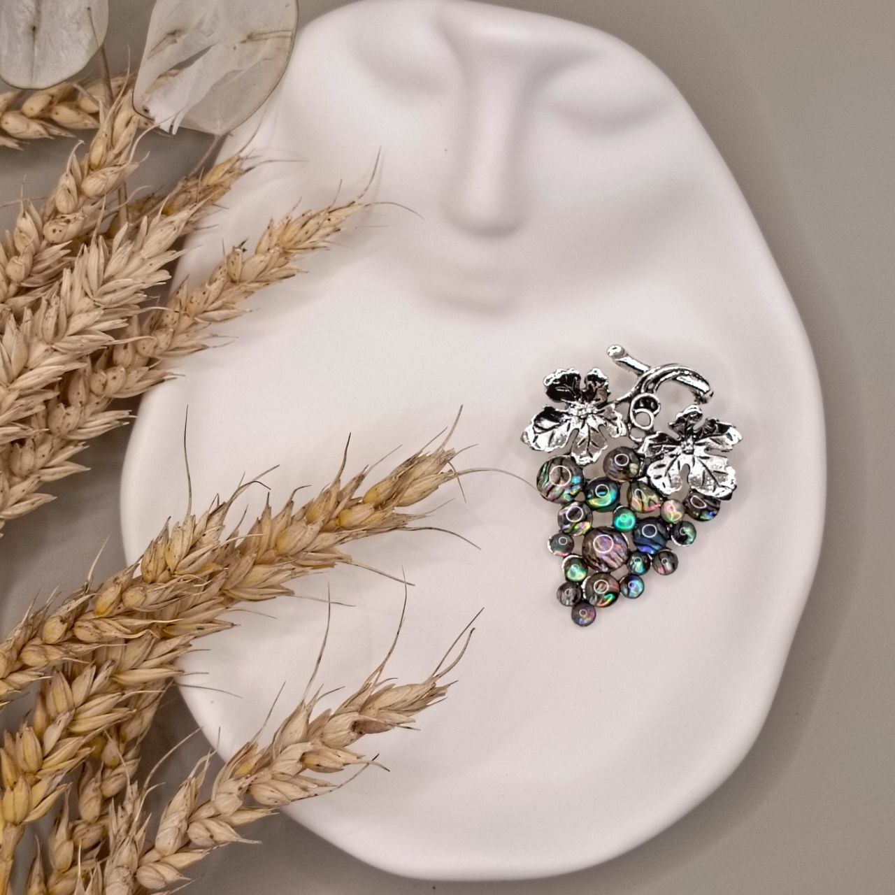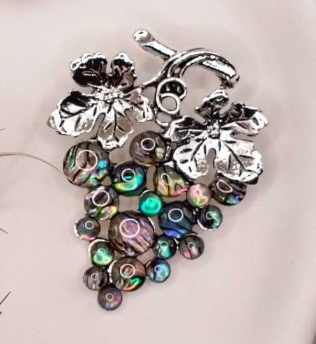 Брошь "Веточка винограда" из цинкового сплава с ракушечником, и смолы со стразами.