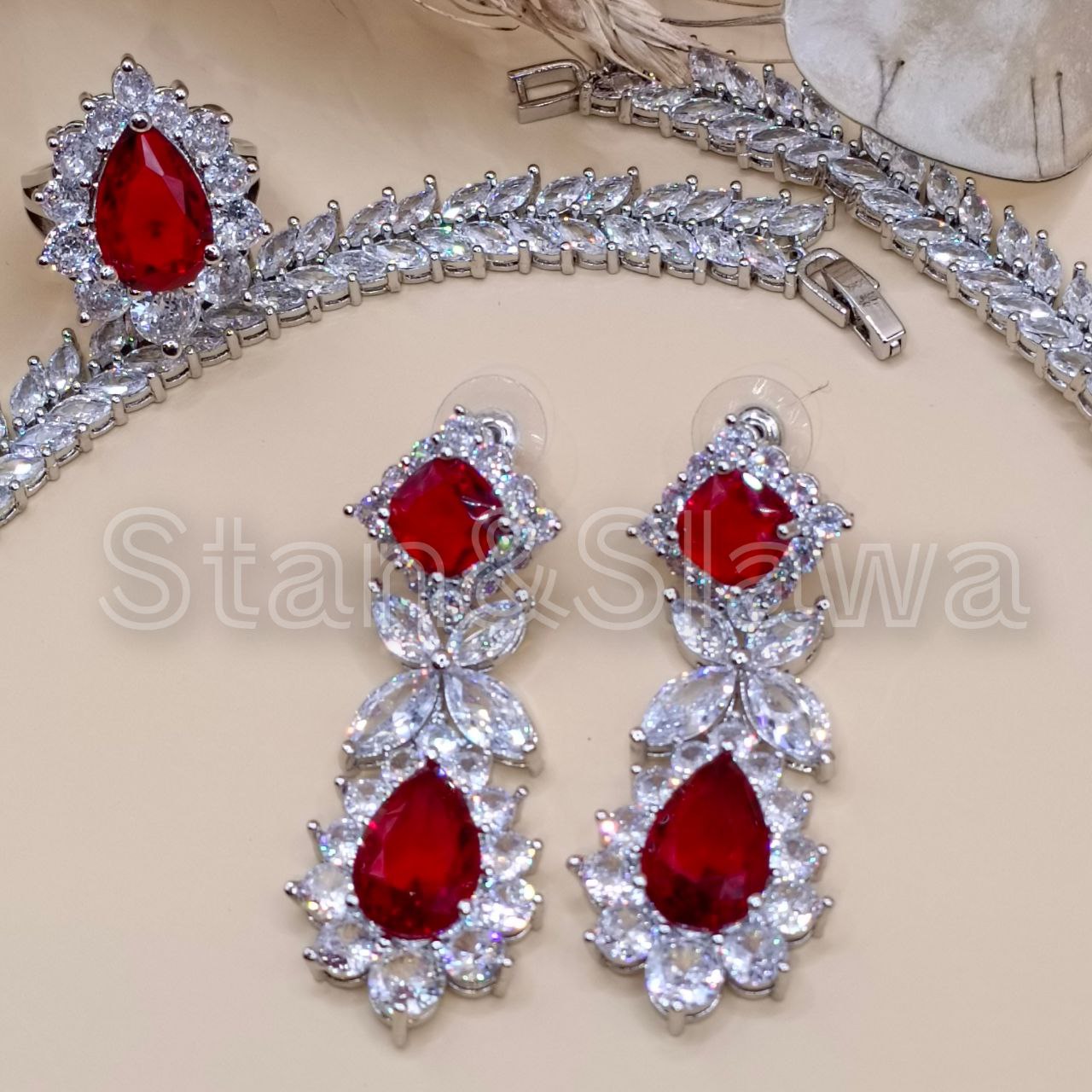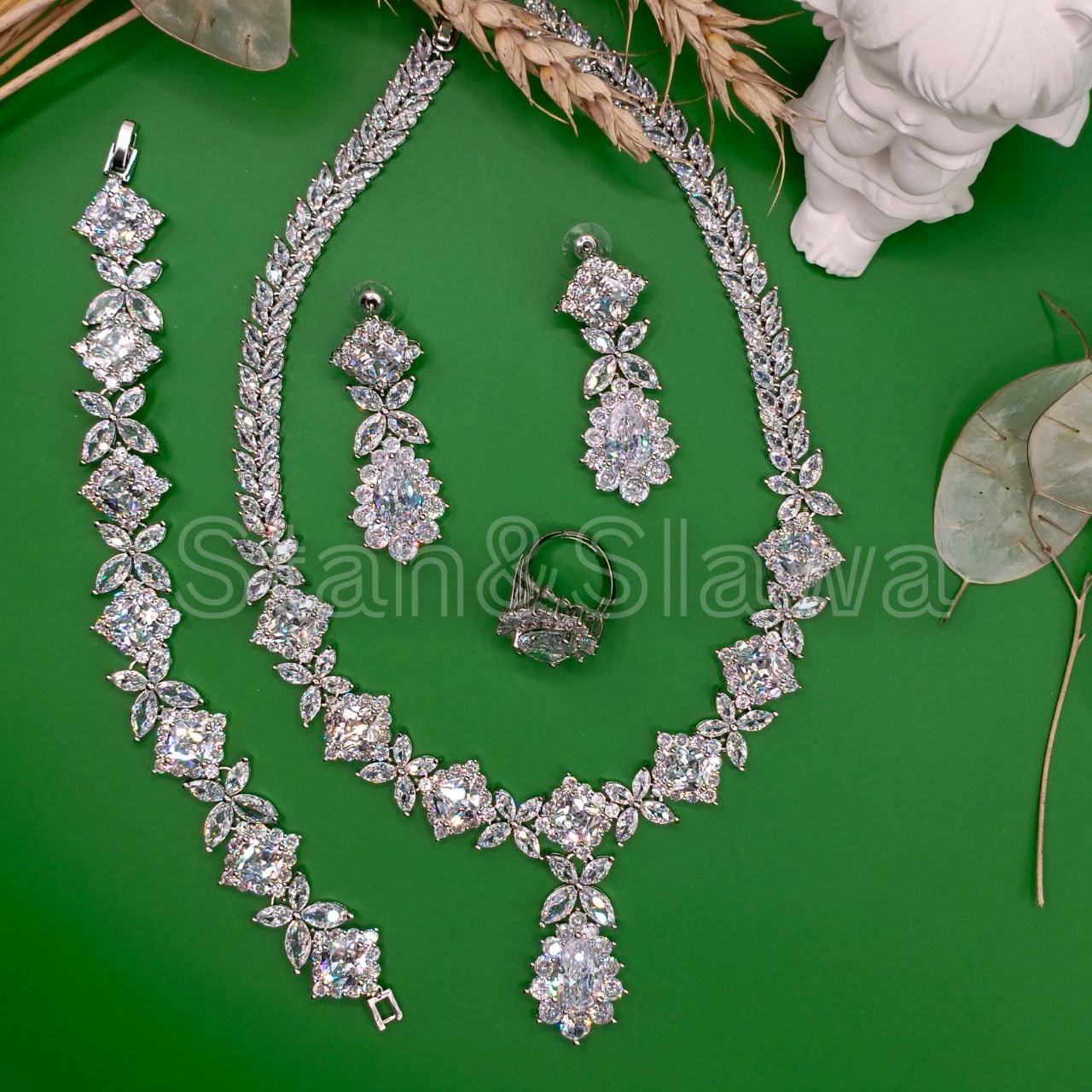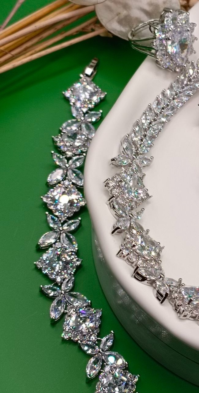 Набор из меди и кубического циркона ААА. Ожерелье 45 см, кольцо с изменяемым размером, серьги 5,3см, кольцо 3см, браслет 18см. Элегантное украшение подчеркивает изысканность образа и подходит ко многим нарядам. Комплект выполнен из высококачественного металла с гипоаллергенным покрытием, что обеспечивает комфорт при носке и долговечность изделий. Категория камня — ювелирный кубический циркон. Выполнен в нейтральной цветовой гамме, легко сочетается с другими аксессуарами. Идеально в качестве подарка или дополнения к собственному гардеробу.