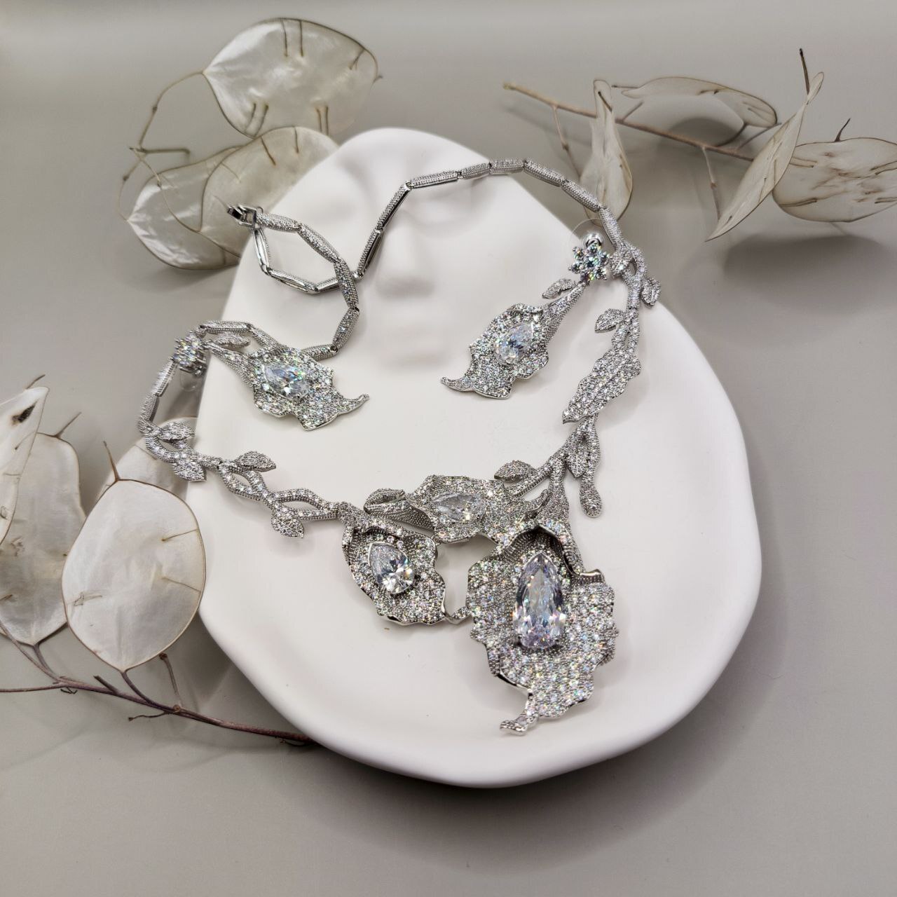Ожерелье выполнено из меди и кубического циркона ААА. Длина ожерелья 44см, длинна цветочного принта 6,0 см, длина серег 5,2 - ш1,9.см. Вес изделия 65,3 г. Материал отличается гипоаллергенностью и долговечностью, прекрасно сочетается с различными стилями одежды. Комплект идеально подойдет как для повседневного образа, так и для особого случая. Элегантное исполнение и изысканный дизайн подчеркнут индивидуальность и придадут уверенности своему владельцу. Благодаря высокому качеству камней AAA, украшения надолго сохранят блеск и роскошный внешний вид.